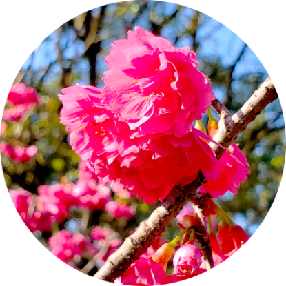春節期間,牧場內五種櫻花陸續綻放,